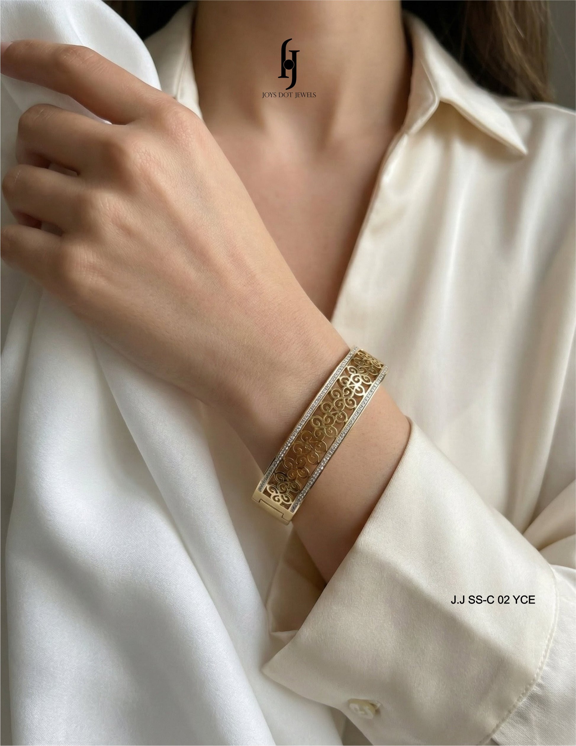 Obsessed with that effortless royal aesthetic? This Anti-Tarnish Filigree Bangle is the ultimate flex for your jewelry collection. Featuring an intricate, vintage-inspired pattern bordered by shimmering Zircon stones, it offers that coveted "high-end look for less" without the luxury price tag. Whether you wear it solo for a sophisticated office look or stack it for a wedding event, this bangle is a must-have for the modern Pakistani woman.