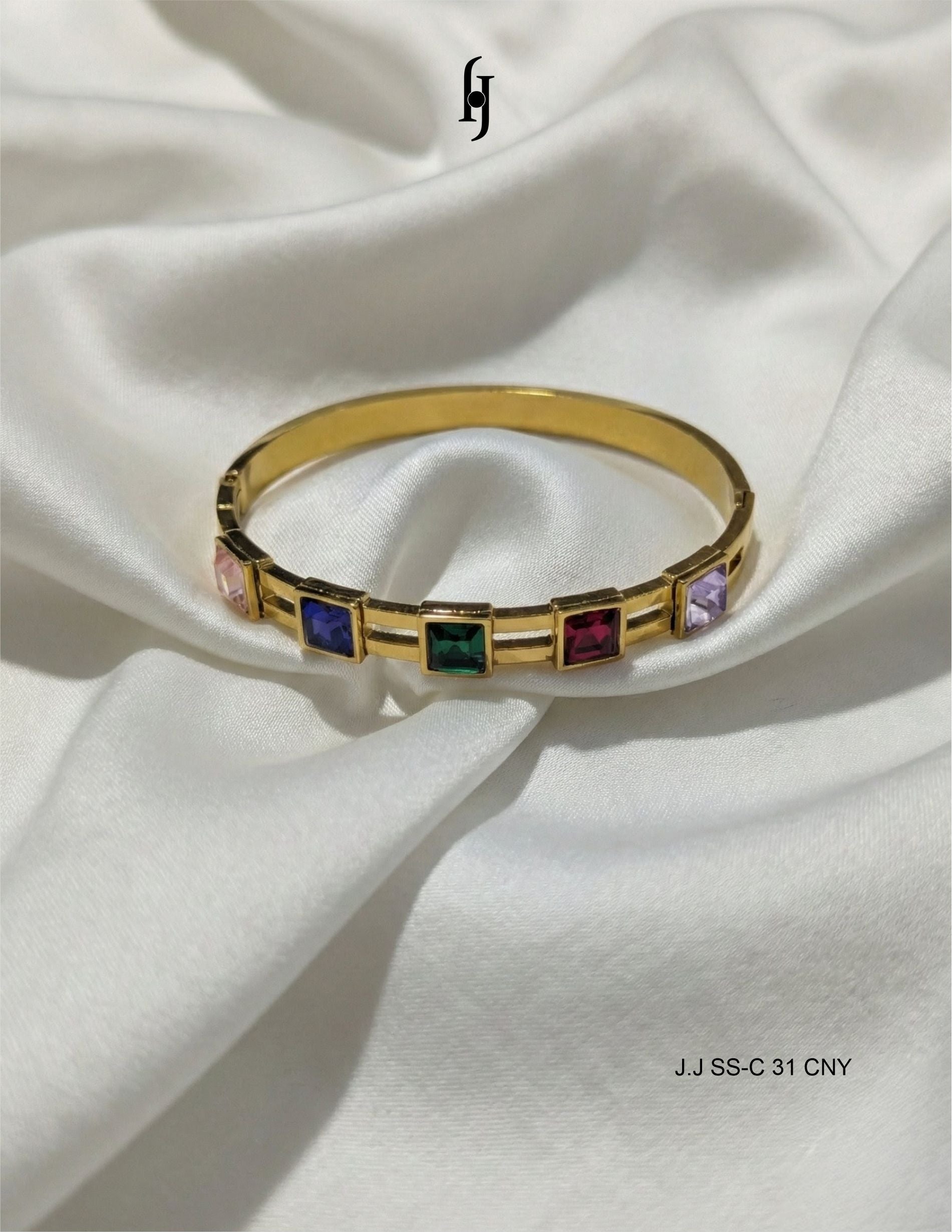 Stone: Vibrant multi-colored square zircons (Pink, Blue, Green, Red, Purple).